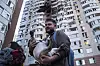 En man och hans hund flyr från ett skadat flervåningshus i Kiev på fredagen.