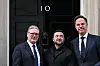 Storbritanniens premiärminister Keir Starmer, Ukrainas president Volodymyr Zelenskyj och Natos generalsekreterare Mark Rutte vid 10 Downing Street.