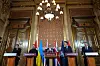 Danmarks statsminister Mette Frederiksen (vänster), Ukrainas president Volodymyr Zelenskyj, värden Keir Starmer somär brittisk premiärminister, Natos generalsekreterare Mark Rutte och Nederländernas premiärminister Dick Schoof på avslutande presskonferens i London.