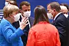 Dåvarande statsminister Stefan Löfven (längst till höger) i diskussion med Tysklands förra förbundskansler Angela Merkel, Frankrikes president Emmanuel Macron och Finlands förra statsminister Sanna Marin under budgetförhandlingar i EU i juli 2020. Arkivfoto.