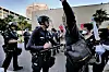 En polis använder en batong för att få en demonstrant att backa i centrala Los Angeles på måndagen lokal tid.