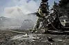En brandman släcker en eld på lördagen efter en rysk drönarattack mot en marknadsplats i staden Druzjkivka i Donetsk-regionen i Ukraina.