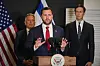 USA:s vicepresident JD Vance, flankerad av särskilda sändebudet Steve Witkoff (till vänster) och rådgivaren Jared Kushner, på presskonferensen.