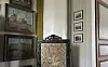 Vitmålad plåtspis i salskammaren på Norrgårds i Tärnebolstad. En synnerligen utsirad brasskärm på pelarfot döljer spisluckorna.Foto: