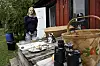 Christel Kvarnström, Felicia Holländer och Sven-Erik Jansson tog med sig hundarna Våfflan och Kakan till Silverstrands bigård i Lemland.Daniel Eriksson